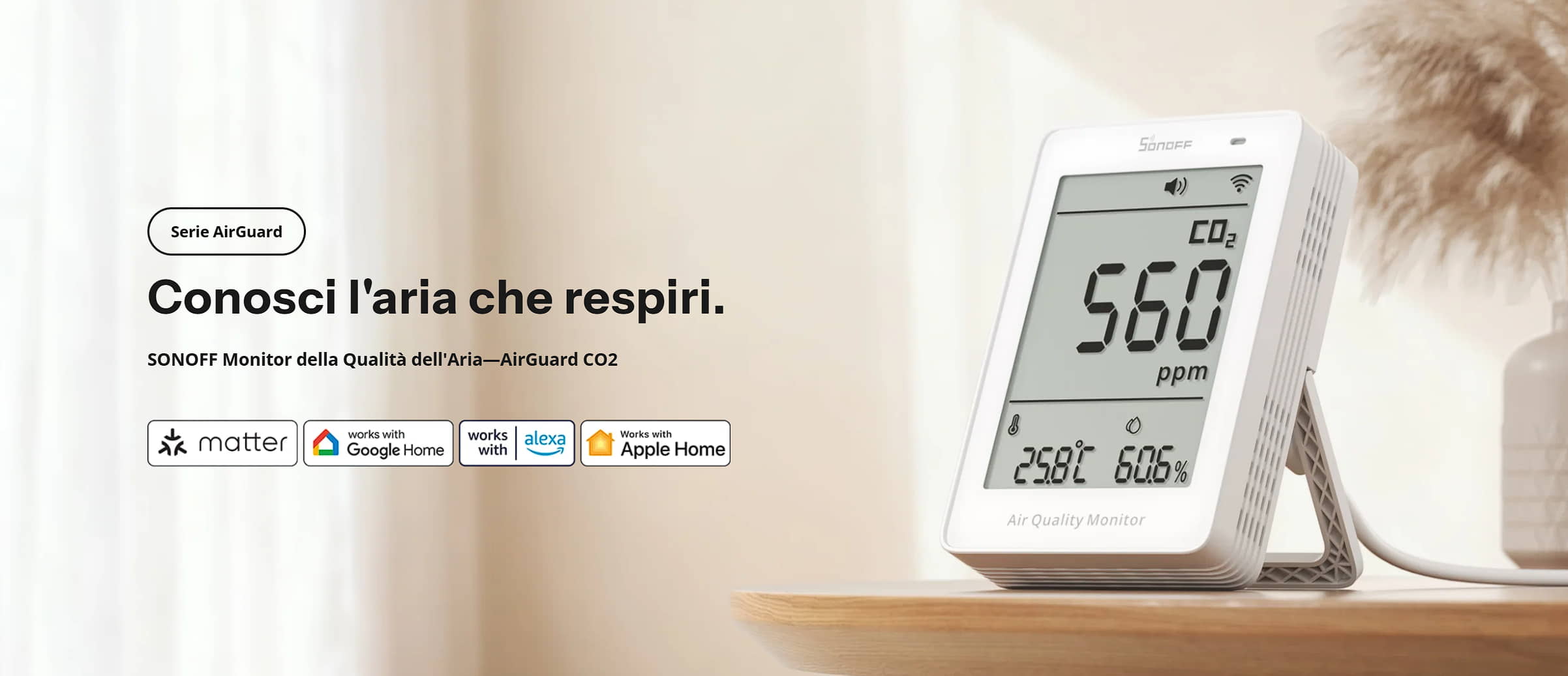 L'aria che respiri in casa può influire su concentrazione, energia e salute molto più di quanto pensi. SONOFF AirGuard CO2 (SAWF-08P) è il monitor della qualità dell'aria smart che misura in tempo reale i livelli di CO₂, temperatura e umidità, si integra con la tua smart home tramite il protocollo Matter e ti avvisa istantaneamente quando la qualità dell'aria peggiora.