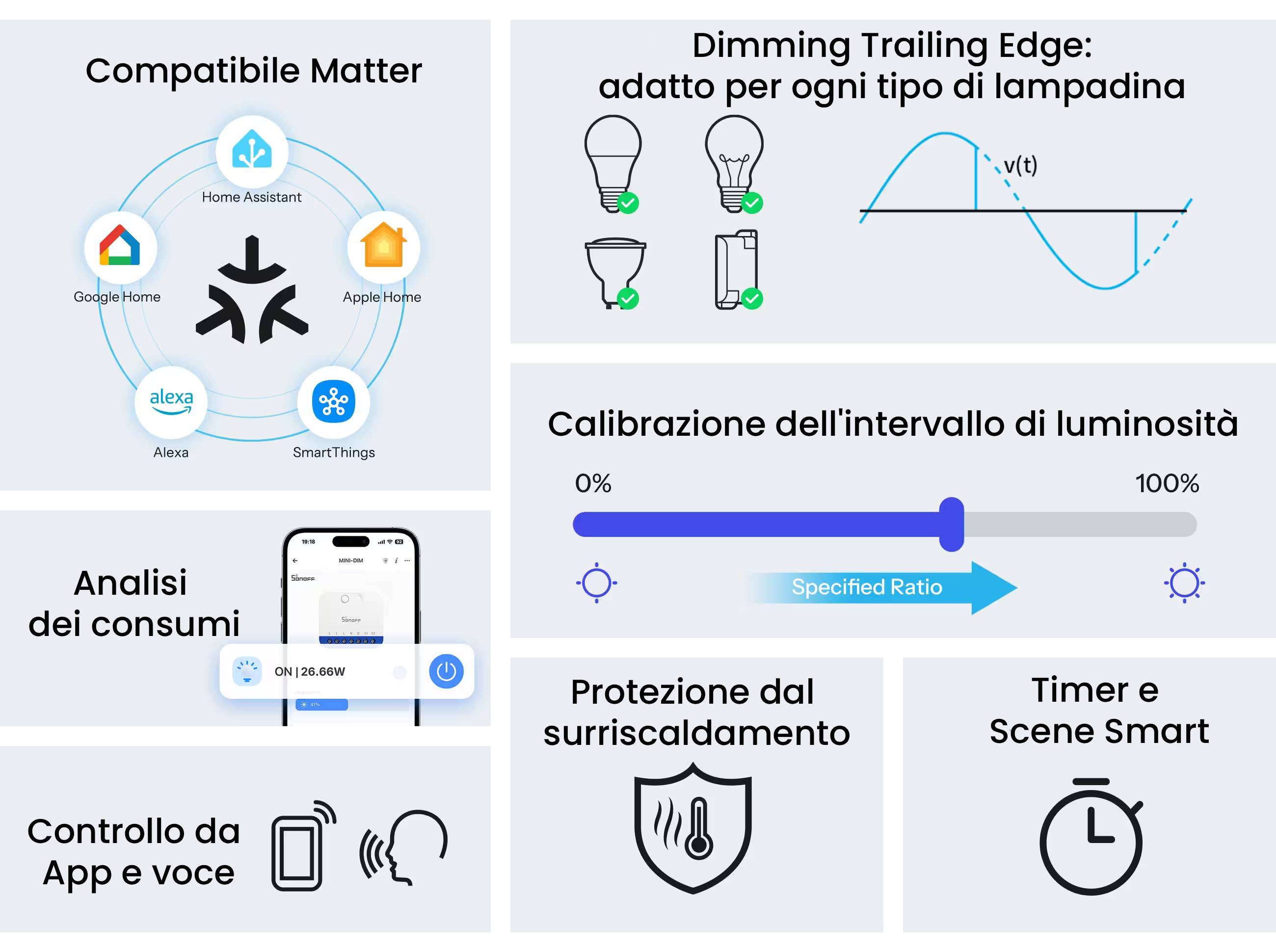 Funzioni principali: dimmer smart, monitoraggio consumi, calibrazione luminosità, protezione termica, timer, controllo vocale, scene smart.